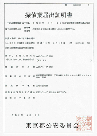探偵業届出証明番号:東京都公安委員会【NO'30200103】その他各支店
